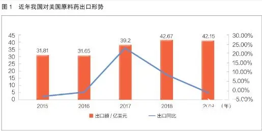 此外,統(tǒng)計數(shù)據(jù)還顯示,2019年,我國對美出口原料藥貨值42.15億美元,同比降低1.23%,三年來首次出現(xiàn)負增長(見圖1)。