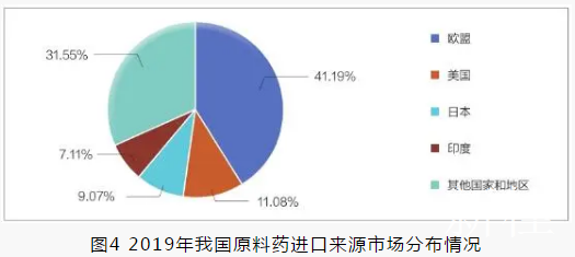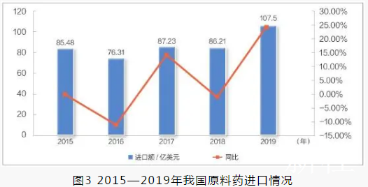 我國既是原料藥生產(chǎn)和出口大國,又是需求和進口大國。近年來,我國原料藥進口規(guī)模呈現(xiàn)逐年擴大的趨勢,2019年原料藥進口額再創(chuàng)歷史新高,達到107.5億美元,同比增長24.7%(見圖3)。從需求的角度來看,進口大增原因有四:一是仿制藥質(zhì)量和療效一致性評價的深入推進,加大了國內(nèi)對境外高品質(zhì)原料藥的需求;二是國內(nèi)環(huán)保安全要求持續(xù)提升,部分原料藥企業(yè)因環(huán)保問題停產(chǎn)或搬遷而導(dǎo)致供應(yīng)短缺;三是國內(nèi)有些不法企業(yè)進行原料藥品種壟斷控銷,導(dǎo)致一些品種價格大幅提升,有些制劑企業(yè)從而選擇使用境外原料藥;四是跨國企業(yè)為拓展中國市場,加大了從境外采購原料藥的力度。