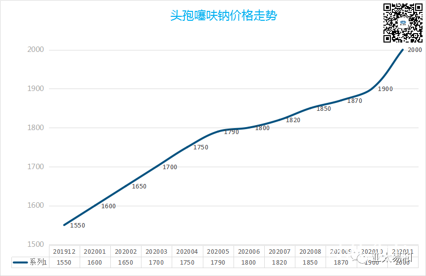 從上圖可以看出,2020年頭孢噻呋鈉的價(jià)格一直呈上升趨勢(shì)。上半年緩慢持續(xù)上升,步伐較穩(wěn);下半年一路高歌,突飛猛進(jìn),漲勢(shì)較大。8-11月,由于原材料短缺,很難采購(gòu)到原料,貨源稀少,廠家雖然報(bào)價(jià),但是供應(yīng)短缺,大多數(shù)供應(yīng)商很難采購(gòu)到貨。由于供不應(yīng)求導(dǎo)致價(jià)格飆升,11月份價(jià)格已經(jīng)到達(dá)了2000以上,比年初上漲500,漲幅達(dá)到25%以上。