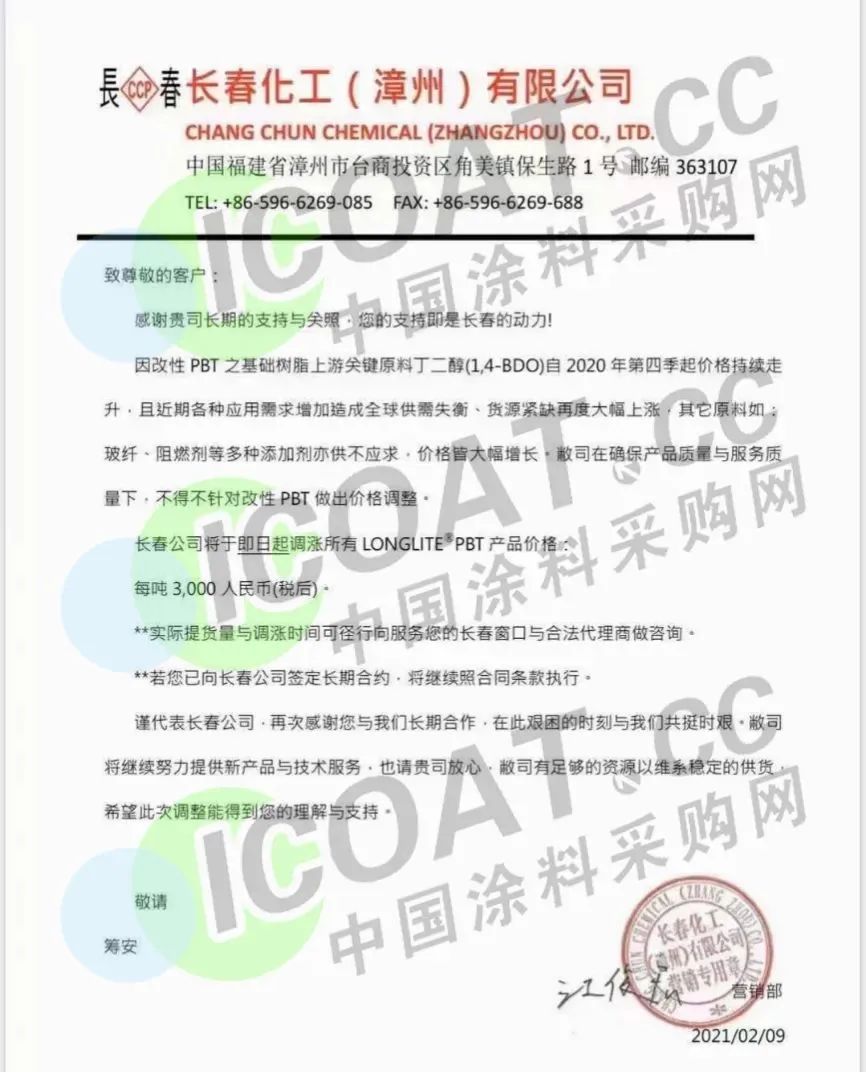 長春化工(漳州)有限公司發(fā)函,稱因改性PBT基礎(chǔ)樹脂上游關(guān)鍵原料正丁醇自2020年第四季度起價(jià)格持續(xù)走升,且近期各種應(yīng)用需求增加造成全球供需失衡、貨源緊缺再度大幅調(diào)漲,即日起調(diào)漲所有LONGLITE PBT產(chǎn)品價(jià)格,上漲3000元/噸。