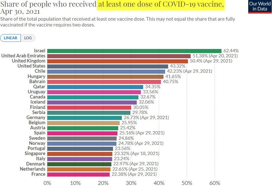 截止4.30日,疫苗接種率較高的國家依次為以色列(62.44%)、阿拉伯(51.38%)、英國(50.4%)、美國(43.32%)、智利(42.23%),數(shù)據(jù)來源于《Our World in Data》。我國人口龐大以及部分人群對(duì)疫苗的抵觸,因此新冠疫苗的接種率不高。此前安徽肥西縣因新增新冠病例,使得群眾的疫苗接種意識(shí)大大增強(qiáng),現(xiàn)已接種疫苗超11萬劑次,位居合肥市縣區(qū)第一,截至5月15日肥西縣累計(jì)完成核酸檢測(cè)11萬人次,結(jié)果均為陰性!美國政府設(shè)定的疫苗接種率目標(biāo)為7月4日前達(dá)到70%,目前65歲以上的老年人群中,超過82%的人至少接種了一針疫苗。
