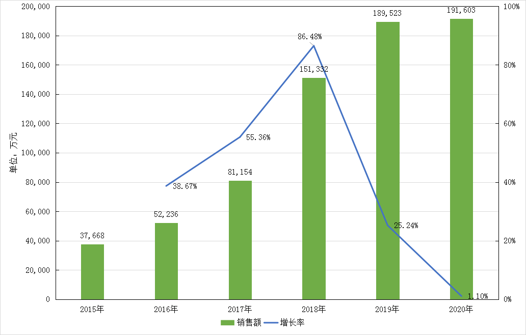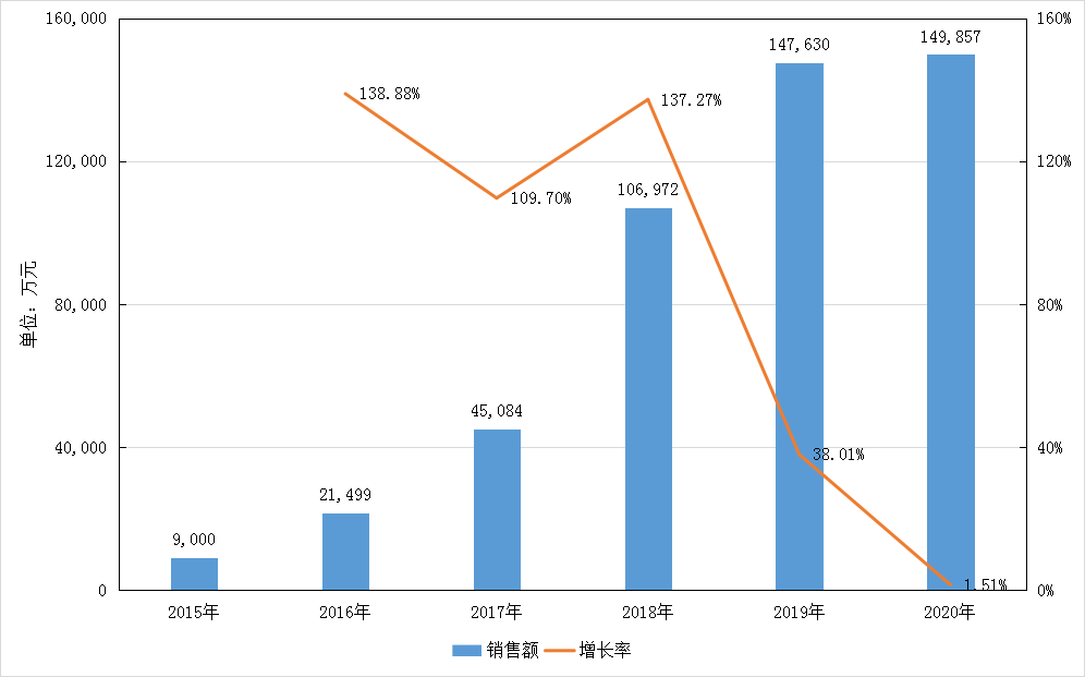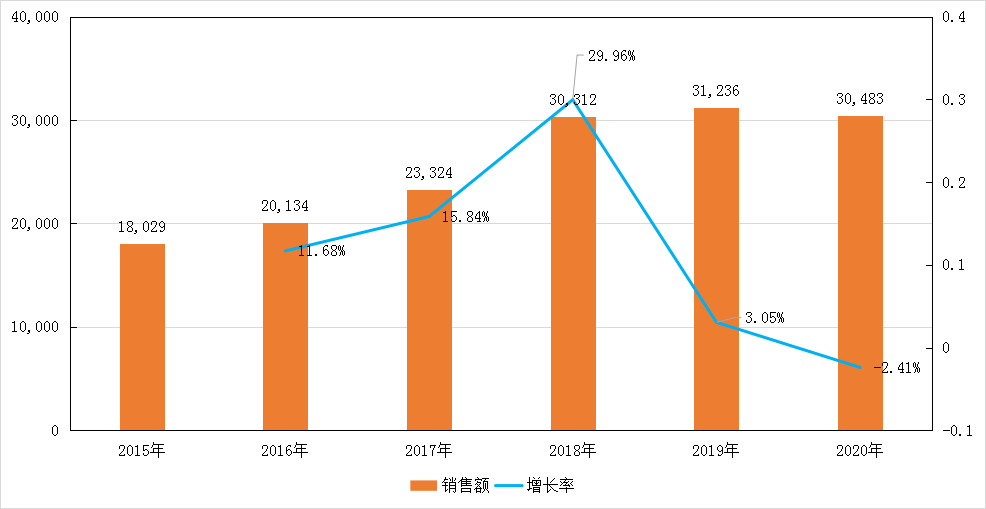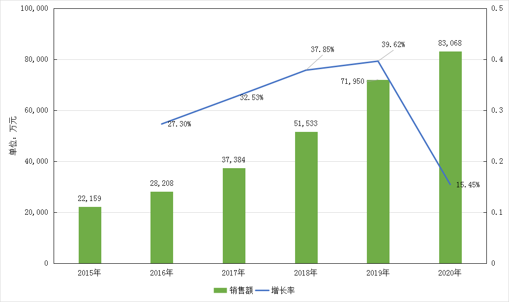 圖6 2015-2020年我國公立醫(yī)療機構(gòu)苯溴馬隆銷售額和增長率