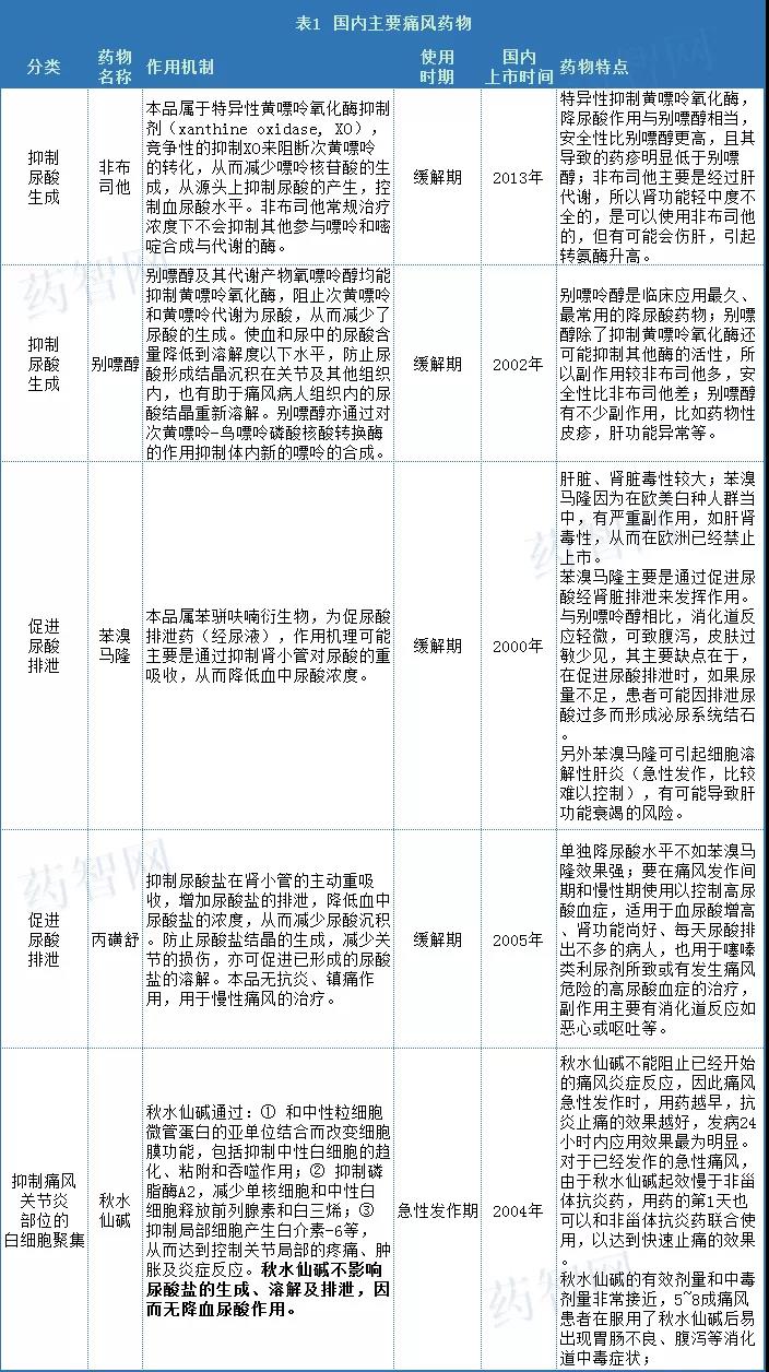 其中有兩個很重要的原因,一是非布司他的出現(xiàn),二是患者對藥物不良反應(yīng)的擔(dān)心,腎功能不全的患者及有泌尿系統(tǒng)結(jié)石的患者不宜使用,各國醫(yī)學(xué)指南已不再推薦其為臨床首選用藥。