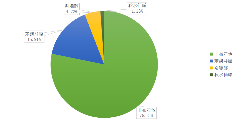 其中,非布司他以78.21%的市場份額遙遙領(lǐng)先,苯溴馬隆占15.91%、別嘌醇占4.72%、秋水仙堿占1.16%的份額。