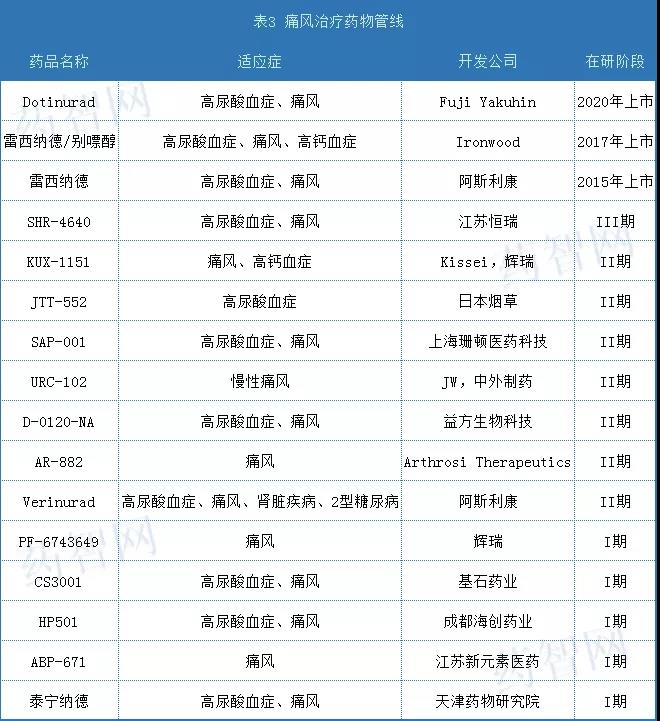 從現(xiàn)有治療痛風(fēng)的研究來看,有些藥物已經(jīng)過臨床證實,具有較好的效果。但現(xiàn)有治療痛風(fēng)的藥物種類仍非常欠缺,數(shù)量有限,且部分藥物副作用明顯,不具備很好的耐受性。現(xiàn)有處于臨床研究階段的管線也不多(表3)