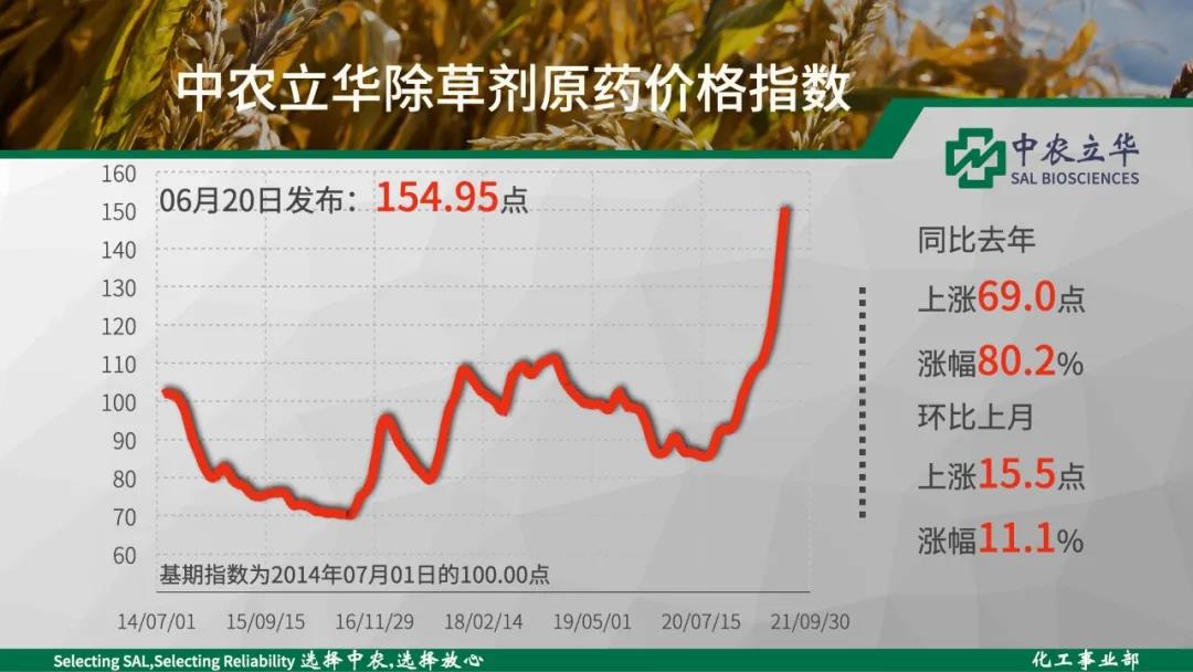 除草劑進(jìn)入傳統(tǒng)用藥淡季,需求開始回落,但滅生性除草劑均大幅上漲。2021年06月20日中農(nóng)立華除草劑原藥價格指數(shù)報154.95點,其中草甘膦原藥繼續(xù)暴漲,創(chuàng)出近十年歷史新高。