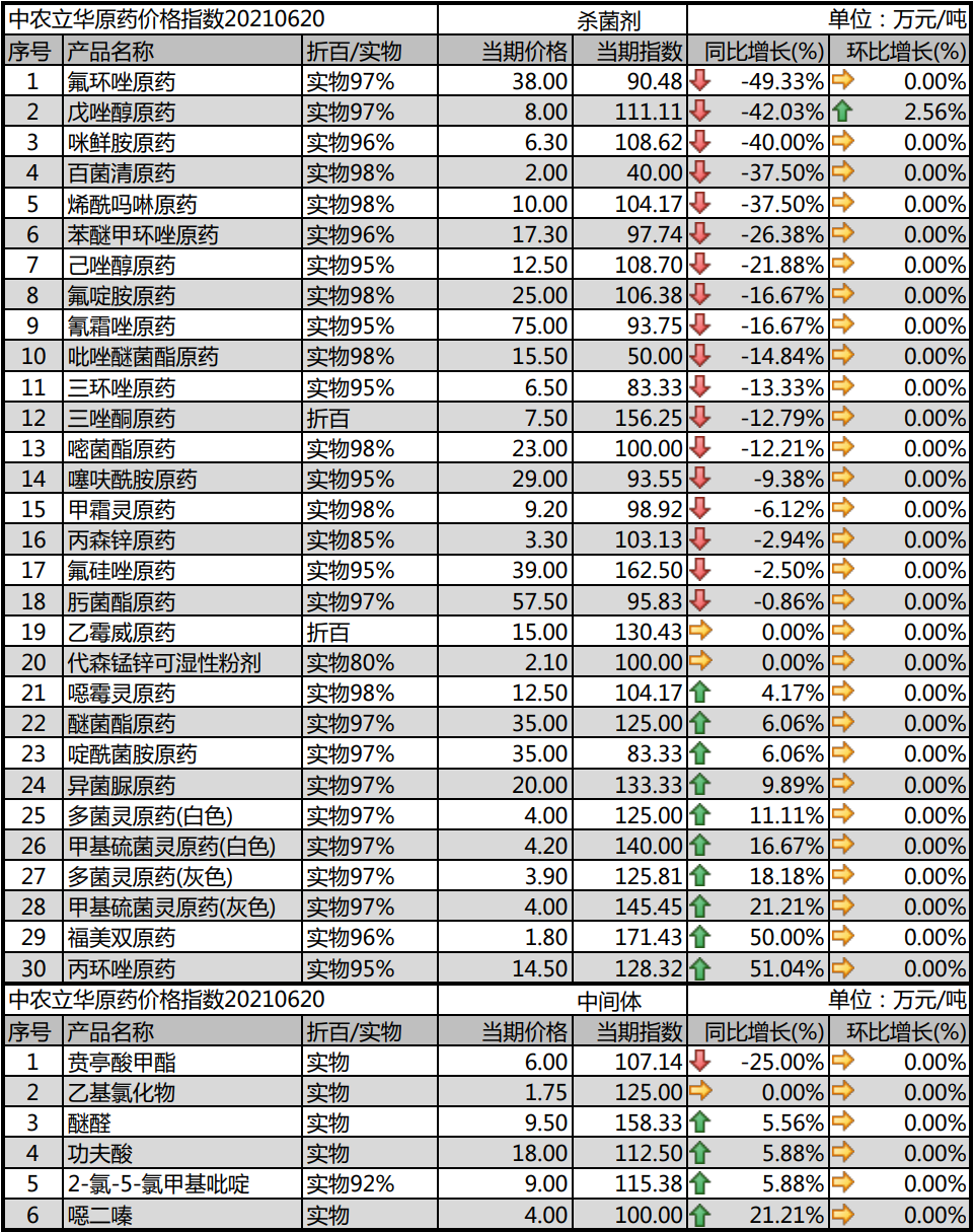 2021年06月20日中農(nóng)立華殺蟲劑原藥價格指數(shù)報104.69點,環(huán)比上月大幅上漲4.00%。上漲:氯氰菊酯原藥、聯(lián)苯菊酯原藥、敵敵畏原藥、氧樂果原藥、吡蟲啉原藥、氟啶脲原藥、辛硫磷原藥、啶蟲脒原藥等持平:噻唑膦原藥、炔螨特原藥、蟲酰肼原藥、氟鈴脲原藥、丙溴磷原藥、馬拉硫磷原藥、聯(lián)苯肼酯原藥、螺螨酯原藥等下跌:噻嗪酮原藥、烯啶蟲胺原藥、丁醚脲原藥、甲氨基阿維菌素苯甲酸鹽原藥等 //05//殺菌劑和中間體