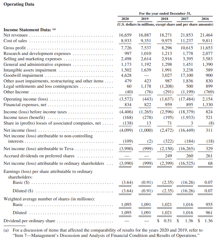 2021年2月10日,梯瓦制藥(Teva)披露2020年財報。該公司的全年總收入從2019年的168.87億美元降至2020年的166.59億美元,同比下跌1.35%,這是2018年以來的第三次下滑。歸母凈利潤為-39.90億美元,同比下降299.4%,這是2017年以來第四次歸母凈利潤為負(fù)。同時,梯瓦也在繼續(xù)進(jìn)行成本控制,其銷售成本、研發(fā)成本、營銷成本分別降至89.33億美元、9.97億美元、24.98億美元。具體運(yùn)營數(shù)據(jù)如下:
