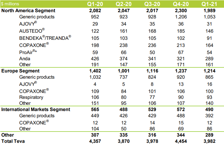 這主要是由于梯瓦歐洲分部的非專利產(chǎn)品、非處方藥和呼吸道產(chǎn)品以及多發(fā)性硬化癥藥物Copaxone(醋酸格拉替雷注射劑)的收入減少;北美分部的Copaxone(醋酸格拉替雷注射劑)和BENDEKA/TREANDA(鹽酸苯達(dá)莫司?。┑氖杖霚p少;梯瓦在日本的的大部分非專利和運(yùn)營資產(chǎn)被剝離,以及在日本的專利產(chǎn)品的監(jiān)管價格下降和仿制藥競爭,也影響了梯瓦在日本的業(yè)務(wù),但這部分被北美分部的非專利產(chǎn)品和亨廷頓治療藥物AUSTEDO(氘代丁苯那嗪)收入的增加所抵消。此外,第一季度收入也受到新冠肺炎大流行影響,導(dǎo)致的某些產(chǎn)品需求產(chǎn)生變化。按活動和地理區(qū)域劃分,具體產(chǎn)品業(yè)績?nèi)缦拢?/span>