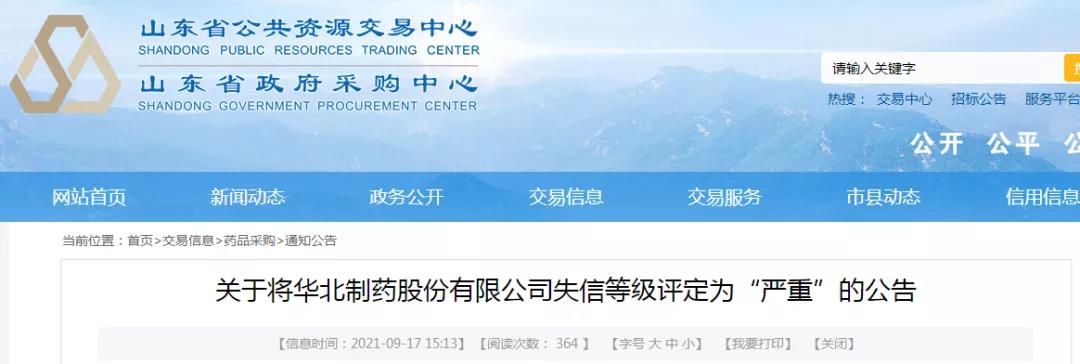 2021年9月17日,山東省公共資源交易中心發(fā)布關(guān)于將華北制藥股份有限公司失信等級(jí)評(píng)定為“嚴(yán)重”的公告。