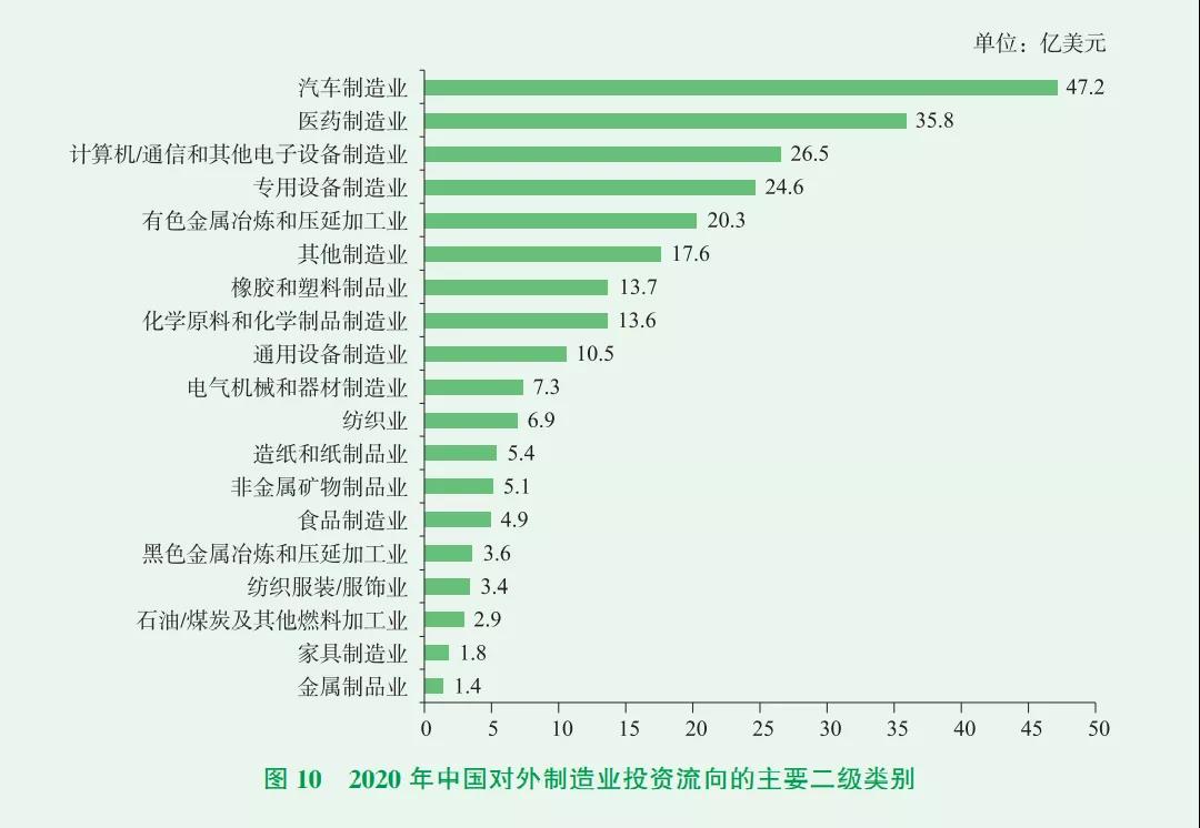 流向制造業(yè)的對外直接投資凈額為258.4億美元,同比增長27.7%,占16.8%。主要流向汽車制造、醫(yī)藥制造、計算機(jī)/通信和其他電子設(shè)備制造、專用設(shè)備制造、有色金屬冶煉和壓延加工、其他制造、橡膠和塑料制品、化學(xué)原料和化學(xué)制品、通用設(shè)備制造、電氣機(jī)械和器材制造、紡織業(yè)、造紙和紙制品業(yè)、非金屬礦物制品、食品制造、黑色金屬冶煉和壓延加工、紡織服裝/服飾制造等。其中,流向化學(xué)原料和化學(xué)制品的投資13.6億美元,占制造業(yè)投資的5.3%。