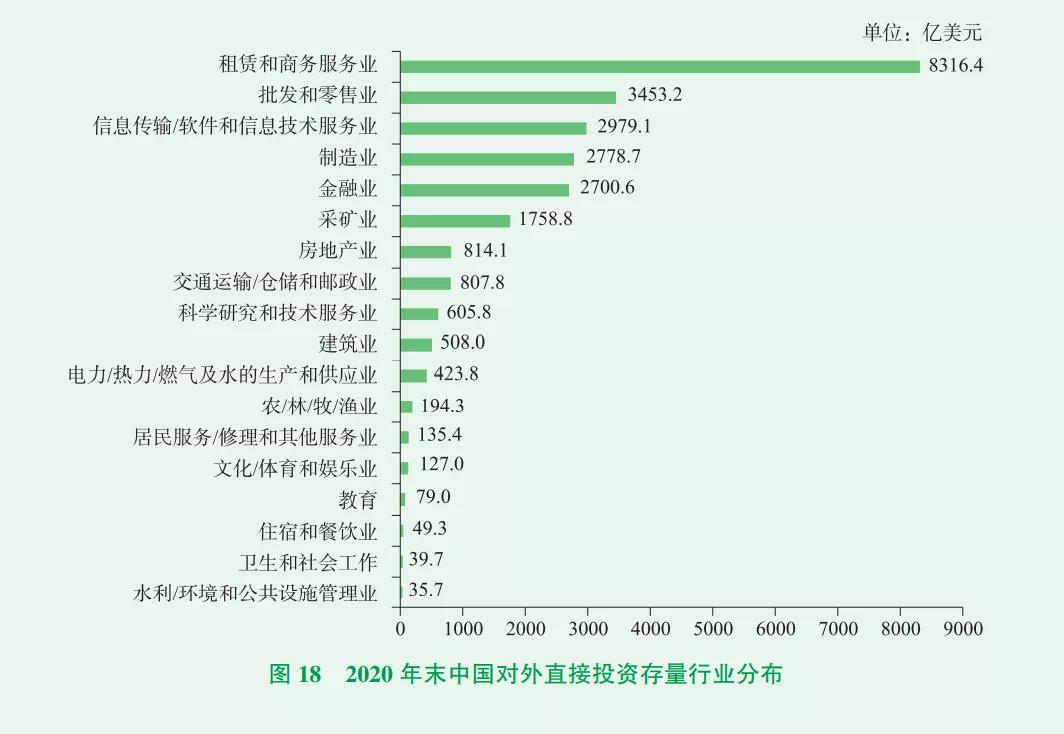 數(shù)據(jù)還顯示,2020年末,中國對外直接投資覆蓋了國民經(jīng)濟(jì)所有行業(yè)類別,存量規(guī)模上千億美元的行業(yè)有六個。