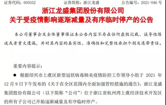 皇馬科技則表示,公司下屬全資子公司浙江綠科安化學(xué)有限公司、浙江皇馬尚宜新材料有限公司受疫情影響于12月9日下午起開始逐漸減量及有序臨時(shí)停產(chǎn);公司產(chǎn)品均由上述兩家全資子公司生產(chǎn),占公司的全部產(chǎn)能。