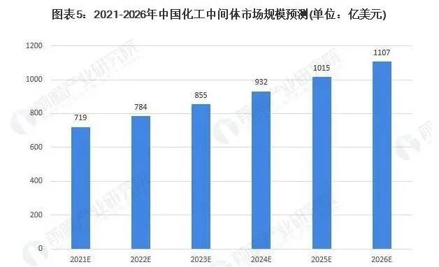 在市場方面,農(nóng)業(yè)、醫(yī)藥等方面的大型市場仍然會提高化工中間體的市場規(guī)模,預計到2026年我國化工中間體市場規(guī)模約為1107億美元。