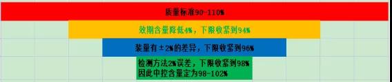 對于儲存期間含量逐漸下降的品種,中控含量限度除了要包容方法的誤差外,還要包容含量降低的幅度。假如成品的含量限度是90.0%-110.0%,含量在效期內(nèi)預期降低6%,檢測誤差不會超過2%,則中控限度應(yīng)定為98.0%-102.0%。