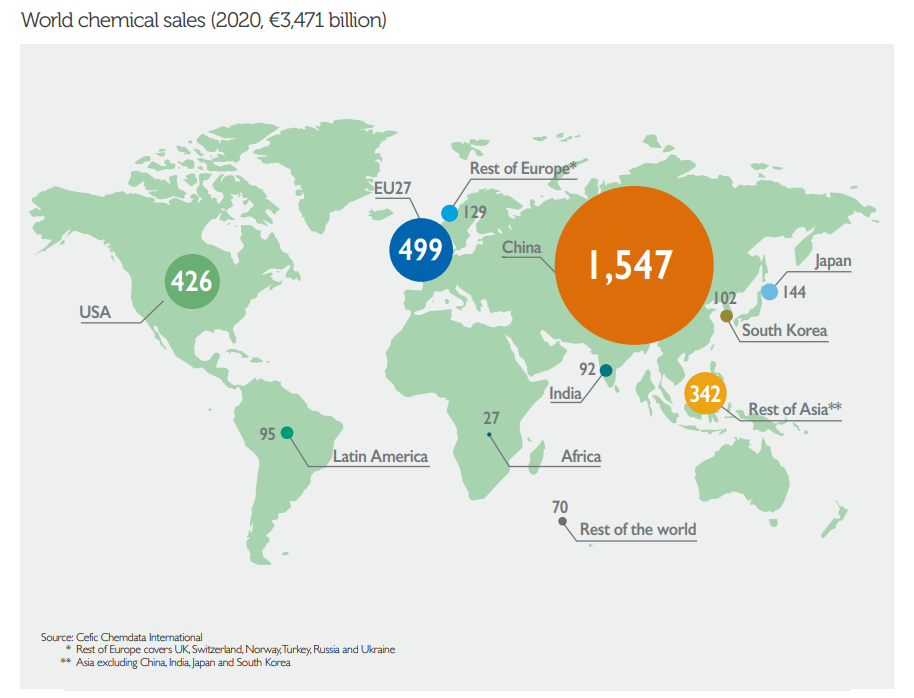據(jù)了解,歐洲是僅次于中國的全球化工行業(yè)重要的生產(chǎn)基地,在2020年,世界化學品銷售額估值為34710億歐元,而整個歐洲市場的化學品銷售額估值高達6280億歐元,占全球市場的18%。