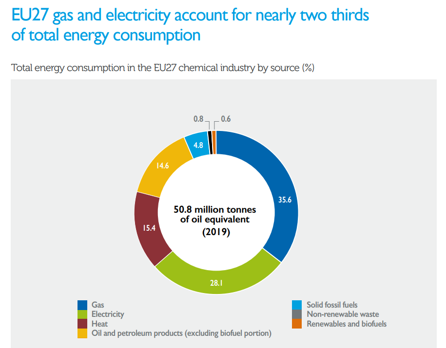 通過翻看歐洲化學理事會發(fā)布的2022年歐洲化學工業(yè)事實與數(shù)據(jù),我們可以看出,歐盟27國在化工品生產(chǎn)耗能方面,天然氣的用量占比最大,為35.6%,此外天然氣在歐洲也可作為發(fā)電、供熱的燃料,算上這部分間接使用天然氣的部分,預計天然氣用量將超過50%,這也體現(xiàn)了天然氣作為燃料來說對于歐洲化工品生產(chǎn)的重要性。