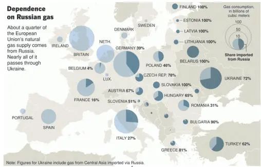 天然氣除了是重要的工業(yè)原料外,同時也是非常優(yōu)質(zhì)的燃料。目前,歐洲天然氣嚴重依賴于盛產(chǎn)天然氣和石油的俄羅斯,約有35%的用量來自俄羅斯。而俄羅斯通過一系列關(guān)鍵管道與歐洲能源市場相連,其中最大的一條管道途經(jīng)烏克蘭,這也成為雙方在日益嚴重的危機中的瓶頸。