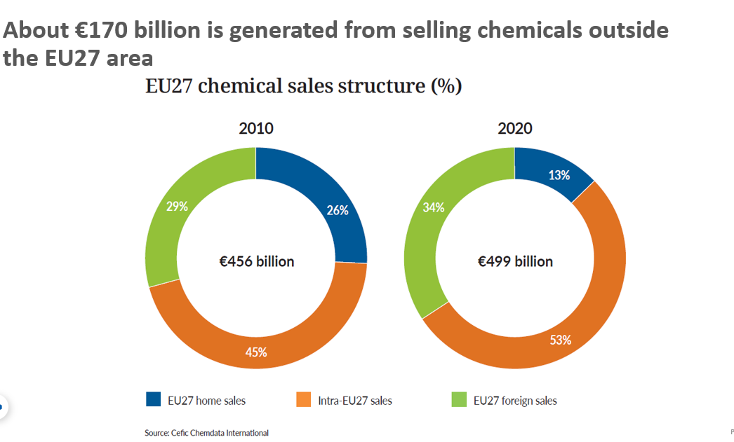 根據(jù)歐洲化學理事會最新發(fā)布的數(shù)據(jù)顯示,2020年,歐盟27國的化學品銷售收入來源分布中,歐盟國內(nèi)市場占比13%,歐盟內(nèi)部銷售(不包括國內(nèi)收入)占比53%,歐盟對外出口占比34%。通過對比,我們可以看出在這近十年間,歐盟對外出口的占比提高了5個百分點,這也體現(xiàn)了全球貿(mào)易的趨勢,以及歐盟外市場對于化學品需求的增加。