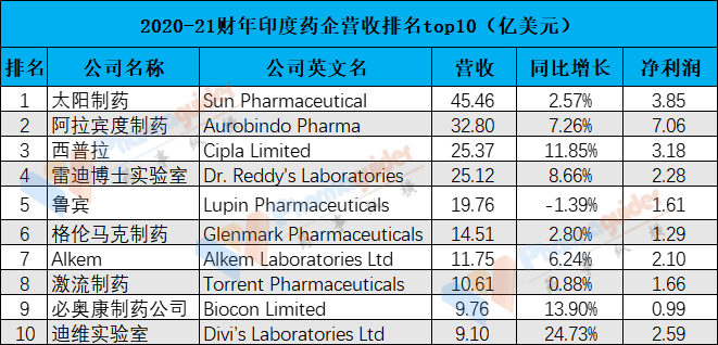 印度top10藥企營收在9-45億美元。其中太陽制藥2021年?duì)I收45.46億美元,排名第一。