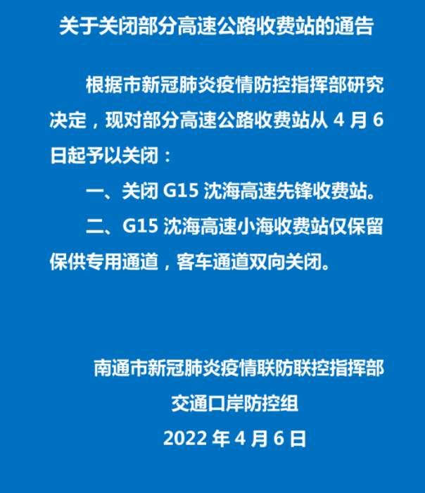3.G4221 滬武高速,關(guān)閉溧水開(kāi)發(fā)區(qū)東雙向出口。4.S55 寧宣高速,關(guān)閉溧水開(kāi)發(fā)區(qū)雙向出口;關(guān)閉和鳳主線雙向出入口。S55 寧宣高速,石臼湖服務(wù)區(qū)雙向關(guān)閉;G25 長(zhǎng)深高速,東廬山服務(wù)區(qū)雙向關(guān)閉。1.G15 沈海高速,關(guān)閉連云港西、新壩、灌云北雙向出入口。2.G25 長(zhǎng)深高速,關(guān)閉贛榆南、大浦、宋跳、花果山機(jī)場(chǎng)、灌云南、灌南雙向出入口;關(guān)閉寧海往杭州方向入口及往山東方向出口;G25 長(zhǎng)深高速,關(guān)閉灌云西往杭州出口及連云港方向入口。3.G30 連霍高速,關(guān)閉云臺(tái)、平明、東海西雙向出入口。G15 沈海高速,海州灣服務(wù)區(qū)、花果山服務(wù)區(qū)、灌云服務(wù)區(qū)雙向關(guān)閉;G30 連霍高速,東海服務(wù)區(qū)雙向關(guān)閉。1、G2 京滬高速,關(guān)閉新沂東雙向出入口。2、G30 連霍高速,關(guān)閉邳州西、呂梁雙向出口。3、S49 新?lián)P高速高速,關(guān)閉新沂南、馬陵山雙向出口。G30 連霍高速,彭城服務(wù)區(qū)往鄭州方向關(guān)閉;G3 京臺(tái)高速,劉集服務(wù)區(qū)雙向關(guān)閉。1、G2 京滬高速,關(guān)閉淮安北、淮安東雙向出入口。2、G25 長(zhǎng)深高速,關(guān)閉高溝雙向出口;關(guān)閉漣水往杭州出口;關(guān)閉淮陰往連云港方向入口及往杭州方向出口;關(guān)閉五里牌雙向出入口。3、G1516 鹽洛高速,關(guān)閉車(chē)橋、凌橋雙向出入口。4、S49 新?lián)P高速,關(guān)閉盱眙北往宿遷方向入口,往南京方向出口;關(guān)閉黃花塘雙向出入口。5、S22 鹽蚌高速,關(guān)閉東陽(yáng)雙向出口。G2 京滬高速,川星服務(wù)區(qū)往北京方向關(guān)閉;G2 京滬高速,六洞服務(wù)區(qū)往上海方向關(guān)閉。1.G15 沈海高速,關(guān)閉六套、蔡橋、興橋、白駒、富安雙向出口。2.G1516 鹽洛高速,關(guān)閉海豐雙向出入口;關(guān)閉秦南、建湖東雙向出口。3.G1515 鹽靖高速,關(guān)閉青墩、張莊、大岡雙向出口。4.S35 阜溧高速,關(guān)閉東溝、建湖西雙向出口。G15 沈海高速,大豐服務(wù)區(qū)雙向關(guān)閉;G1516 鹽洛高速,九龍口雙向關(guān)閉。1.G2 京滬高速,關(guān)閉沭陽(yáng)北、胡集雙向出入口。2.S49 新?lián)P高速,關(guān)閉梅花、泗洪雙向出入口。3.G2513 淮徐高速,關(guān)閉洋河雙向出口;關(guān)閉宿遷西雙向出入口。G2 京滬高速,沭陽(yáng)服務(wù)區(qū)往北京方向關(guān)閉;G2513 淮徐高速,洋河服務(wù)區(qū)往徐州方向關(guān)閉。1.G2 京滬高速,關(guān)閉涇河、真武、江都東雙向出入口;關(guān)閉寶應(yīng)、高郵往上海方向出入口;關(guān)閉浦頭雙向出口。2.S28 啟揚(yáng)高速,關(guān)閉丁伙、郭村雙向出入口。3.S49 新?lián)P高速,關(guān)閉蜀岡主線、陳集雙向出入口。4.G40 滬陜高速,關(guān)閉蔣王雙向出入口。5.S39 江宜高速,關(guān)閉李典頭橋雙向出入口。G2 京滬高速,范水服務(wù)區(qū)往上海方向關(guān)閉;G2 京滬高速,高郵服務(wù)區(qū)往北京方向關(guān)閉;S49 新?lián)P高速,陳集服務(wù)區(qū)雙向關(guān)閉;S39 江宜高速,揚(yáng)州廣陵服務(wù)區(qū)往宜興方向關(guān)閉;G40 滬陜高速,儀征服務(wù)區(qū)雙向關(guān)閉。1.G1515 鹽靖高速,關(guān)閉安豐、新街雙向出口。2.G40 滬陜高速,關(guān)閉廣陵、季市雙向出入口 。3.S28 啟揚(yáng)高速,關(guān)閉泰州北雙向出入口。4.S35 阜溧高速,關(guān)閉俞垛、大泗雙向出口;關(guān)閉高港雙向出入口。G2 京滬高速,宣堡服務(wù)區(qū)、廣陵服務(wù)區(qū)雙向關(guān)閉;S35 阜溧高速,大泗服務(wù)區(qū)雙向關(guān)閉。1、G15 沈海高速,關(guān)閉劉橋雙向出口;關(guān)閉先鋒雙向出入口。2、G40 滬陜高速,關(guān)閉疊石橋雙向出口;關(guān)閉大生、九華雙向出入口;關(guān)閉啟東東雙向入口;關(guān)閉葛市往南京方向出入口;如皋港往上海方向出入口。3、S79 南通支線,關(guān)閉平潮往南京方向入口,往南通方向出口。4、S28 啟揚(yáng)高速,關(guān)閉如皋東、馬塘、海門(mén)港雙向出口;關(guān)閉合作、南陽(yáng)雙向出入口。5、S15 洋通高速,關(guān)閉騎岸雙向出口。G15 沈海高速,如皋服務(wù)區(qū)、先鋒服務(wù)區(qū)雙向關(guān)閉;蘇通大橋服務(wù)區(qū)往南通方向關(guān)閉。1.G42 滬蓉高速,關(guān)閉句容、河陽(yáng)雙向出口。2.G4011 揚(yáng)溧高速,關(guān)閉鎮(zhèn)江西、上黨雙向出口。3.G4221 滬武高速,關(guān)閉天王雙向出入口。S35 阜溧高速關(guān)閉丹陽(yáng)北、鎮(zhèn)江新區(qū)東、高橋雙向出口;關(guān)閉揚(yáng)中雙向出入口。G42 滬蓉高速,竇莊服務(wù)區(qū)雙向關(guān)閉。1.G42 滬蓉高速,關(guān)閉常州雙向出入口。2.G4221 滬武高速,關(guān)閉嘉澤、滆湖、戚墅堰雙向出入口。3.G25 長(zhǎng)深高速,關(guān)閉曹山雙向出入口。4.G4012 溧寧高速,關(guān)閉南渡雙向出口。5.S35 阜溧高速,關(guān)閉儒林、長(zhǎng)蕩湖雙向出入口。6.S39 江宜高速,關(guān)閉孟河往宜興方向出口;關(guān)閉春江、龍城大道、武進(jìn)經(jīng)發(fā)區(qū)、武高新西雙向出入口;關(guān)閉和橋雙向出口。7.S58 滬常高速,關(guān)閉運(yùn)村雙向出入口。S68 溧蕪高速,關(guān)閉湯橋雙向出入口。G4221 滬武高速,茅山服務(wù)區(qū)雙向關(guān)閉;G25 長(zhǎng)深高速,天目湖服務(wù)區(q