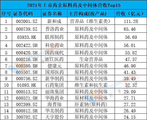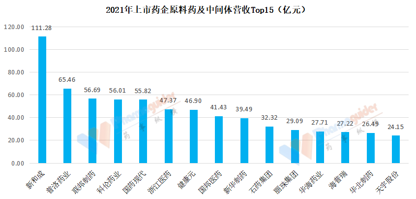 總的來說,前5名公司的原料藥及中間體業(yè)務(wù)營收都在50億元以上,top15的營收都在20億元以上。