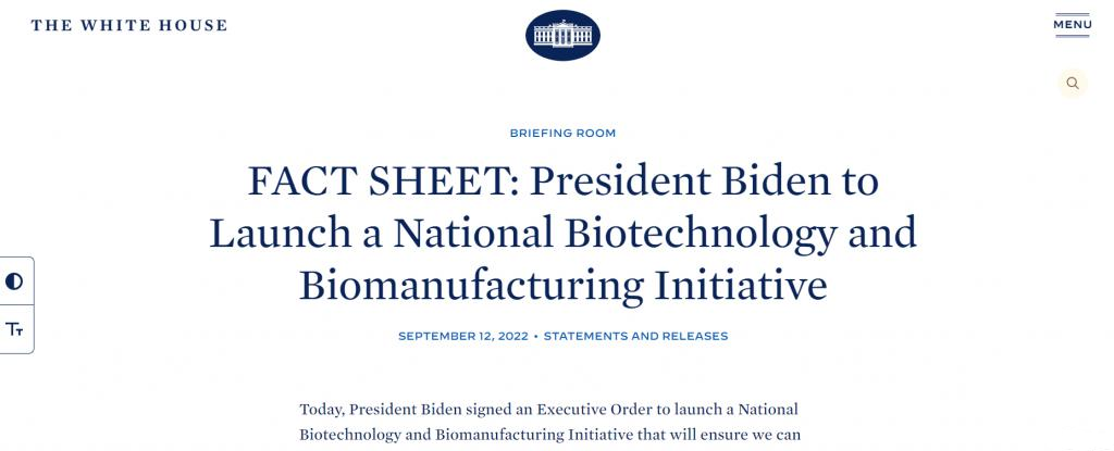 9月12日,白宮官網(wǎng)發(fā)布簡報,宣布美國總統(tǒng)已簽署了一項鼓勵美國生物技術(shù)生產(chǎn)和研究的行政命令。