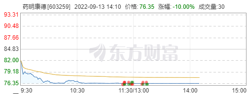 藥明康德到下午13點15分,一字跌停,跌幅10%,報收76.35元/股,總市值為2260億元,總市值較昨日已蒸發(fā)超250億元。
