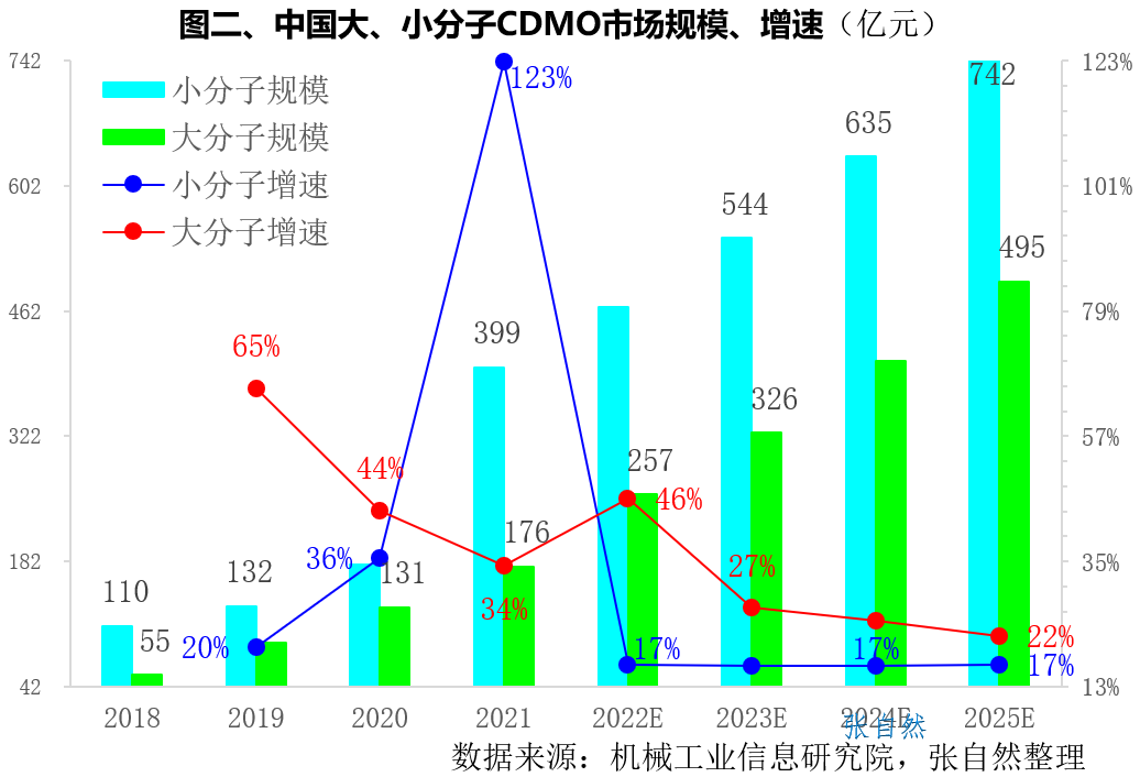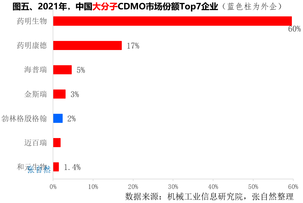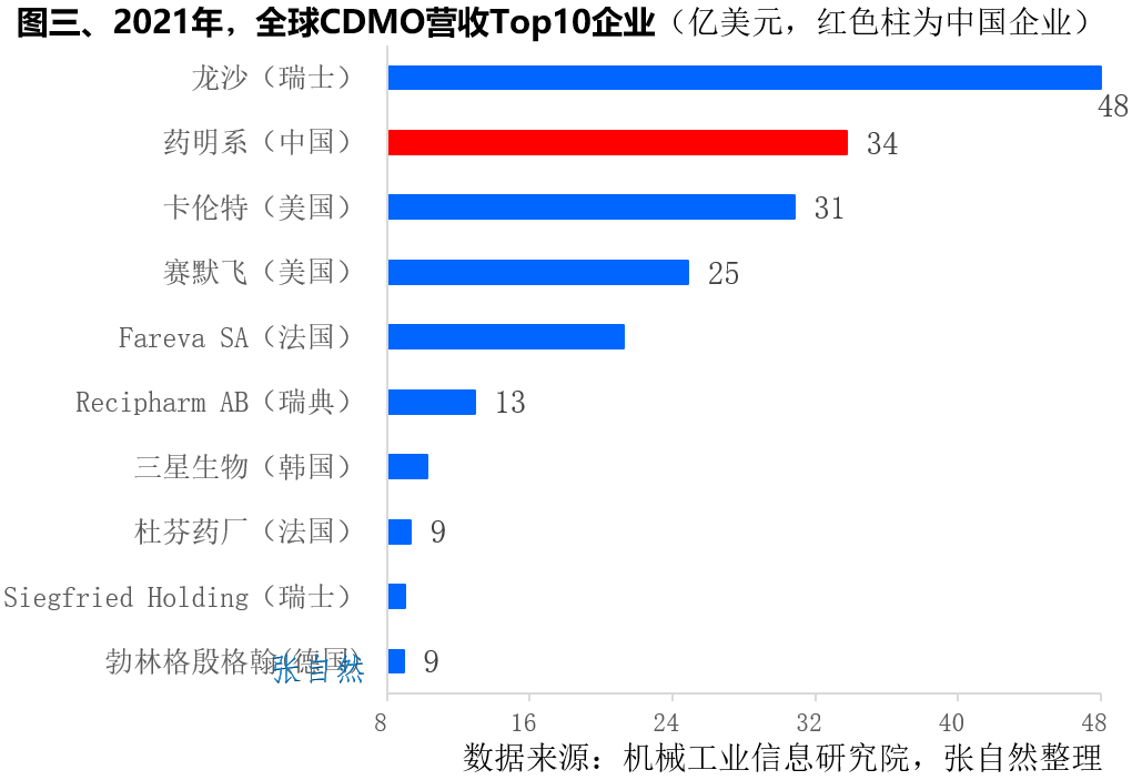所謂CDMO,即定制研發(fā)生產(chǎn)機(jī)構(gòu)(Contract Development and Manufacturing Organization),主要為藥企提供臨床新藥工藝開發(fā)和制備,以及為已上市藥物提供工藝優(yōu)化和規(guī)?;a(chǎn)服務(wù)。CDMO產(chǎn)業(yè)在我國發(fā)展之迅猛可謂一時(shí)無兩,盡管近期資本市場有所波動(dòng),但優(yōu)勢尚存,增勢不減。目前,全球CDMO行業(yè)仍處于高速發(fā)展期,按沙利文統(tǒng)計(jì)口徑,全球CDMO市場規(guī)模由2017年的394億美元增長到了2021年的632 億美元,到2025年將達(dá)到1243億美元。2015年開啟的醫(yī)藥創(chuàng)新熱潮促進(jìn)了我國CDMO產(chǎn)業(yè)的高速發(fā)展,我國CDMO市場規(guī)模由2017年的132億元增長到了2021年的473億元,4年增長了2.6倍,復(fù)合年增長率高達(dá)37.7%,2倍于同期全球CDMO18.5%的復(fù)合增長率,預(yù)計(jì)到2025年將達(dá)到1571億元。我國CDMO市場規(guī)模在全球的占比也由2017年的5%提高到了2021年的13%,到2025年將占到全球市場的1/5。(詳見圖一)小分子一直在我國CDMO產(chǎn)業(yè)占據(jù)主導(dǎo)地位,按機(jī)械工業(yè)信息研究院統(tǒng)計(jì)口徑,我國小分子CDMO市場規(guī)模由2018年的110億元增長到了2021年的399億元,3年增長了2.6倍,預(yù)計(jì)2025年將達(dá)到742億元。我國大分子CDMO的市場規(guī)模由2018年的55億元增加到了2021年的176億元,預(yù)計(jì)到2025年將增加到近500億元(495億元)。2018年到2021年,我國大分子CDMO的復(fù)合增長率為47.4%,稍低于小分子的53.6%。受益于細(xì)分領(lǐng)域的突破,2021年-2026年,大分子的復(fù)合增長率將達(dá)到27.3%,將遠(yuǎn)高于同期小分子16.8%的復(fù)合增長率。(詳見圖二)2021年,全球CDMO營收最大的企業(yè)是瑞士龍沙和我國的藥明系(藥明康德+藥明生物)。在Top10企業(yè)中,歐洲占了6席,美國和亞洲各占2席。如按國家來劃分的話,瑞士、美國和法國各占2席,即瑞士的龍沙(48億美元,第1位)、Siegfried Holding(9億美元,第9位),美國的卡倫特(31億美元,第3位)、賽默飛(25億美元,第4位)和法國的Fareva SA(21億美元,第5位)、杜芬藥廠(9億美元,第8位)。另有4個(gè)國家各占1席,即中國的藥明系(34億美元,第2位)、瑞典的Recipharm AB(13億美元,第6位)、韓國的三星生物(10億美元,第7位)和德國的勃林格殷格翰(9億美元,第10位)。(詳見圖三)2021年,在我國小分子CDMO市場份額Top10企業(yè)中,竟有4家來自同一個(gè)省的同一個(gè)地級(jí)市--浙江省臺(tái)州市,即九洲藥業(yè)、普洛藥業(yè)、聯(lián)盛科技和天宇股份,皆因臺(tái)州是我國乃至全球最重要的化學(xué)原料藥基地,知名原料藥企業(yè)海正、華海、司太立和海翔藥業(yè)等均位于臺(tái)州。帶量采購導(dǎo)致的藥價(jià)下降大大促進(jìn)了藥品使用量的提升,原料藥的消耗量也隨之大幅增加,同時(shí)也推動(dòng)了原料藥企業(yè)向下游制劑環(huán)節(jié)的延伸。臺(tái)州作為原料藥基地,在帶量采購背景下,其成本和技術(shù)優(yōu)勢凸顯,從而實(shí)現(xiàn)了產(chǎn)業(yè)鏈的延伸和產(chǎn)業(yè)升級(jí)。在小分子市場份額Top10企業(yè)中,市場份額最大的是藥明康德(占了35%)。其次是后起之秀凱萊英(占11%),2022年前9個(gè)月,凱萊英營收同比增長高達(dá)167%,傲視群雄,歸母凈利增速更是高達(dá)292%。其后分別是博騰股份(8%)、康龍化成(4.4%)和圣諾生物(1.6%)。(詳見圖四)我國小分子CDMO企業(yè)格局相對(duì)穩(wěn)定,大分子CDMO企業(yè)集中度高企。2021年,大分子CDMO市場份額最大的企業(yè)是藥明系(藥明生物+藥明康德),占了近8成市場(77%)。其次是金斯瑞(3%)、邁百瑞(1.8%)和和元生物(1.4%)。在Top企業(yè)中還有一家外企,即德國的勃林格殷格翰,占了2%的市場,如勃林格殷格翰為上海之江生物的新冠雙特異性抗體藥物SYZJ001提供工藝優(yōu)化及生產(chǎn)制造服務(wù)。(詳見圖五)國內(nèi)CDMO企業(yè)多服務(wù)于臨床階段的工藝開發(fā)和研究,因此需要大量的研發(fā)人員,如藥明生物、凱萊英等企業(yè)的研發(fā)人員數(shù)量占到了員工總數(shù)的40%以上,工程師紅利促進(jìn)了我國CDMO產(chǎn)業(yè)的高速發(fā)展。2020年,全球重點(diǎn)CDMO企業(yè)中,人工成本最低的是我國的凱萊英,其單位人工成本為2.4萬美元/人,只有瑞士Siegfried Holding(12.4萬美元/人)的不到1/5。其次是我國的博騰股份(2.8萬美元/人)和藥明康德(3萬美元/人)也都遠(yuǎn)低于瑞士龍沙的11.8萬美元/人、韓國三星生物的8.1萬美元/人。
