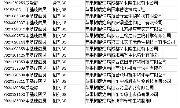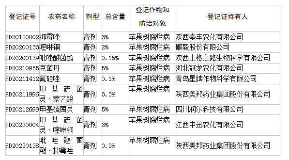 目前我國批準(zhǔn)登記的膏劑(糊劑),主要為殺菌劑、植物生長調(diào)節(jié)劑,個別為衛(wèi)生殺蟲劑。截至2023年5月10日,我國批準(zhǔn)登記并處于有效狀態(tài)的殺菌劑膏劑(糊劑)產(chǎn)品共25個,其中膏劑10個,糊劑15個,涉及甲基硫菌靈(17個)、戊唑醇(2個)、抑霉唑(2個)、喹啉銅(2個)、吡唑醚菌酯(2個)、克菌丹(1個)、氟硅唑(1個)、萘乙酸(1個)等8種有效成分,登記作物和防治對象均為蘋果樹腐爛病。具體登記信息如下: