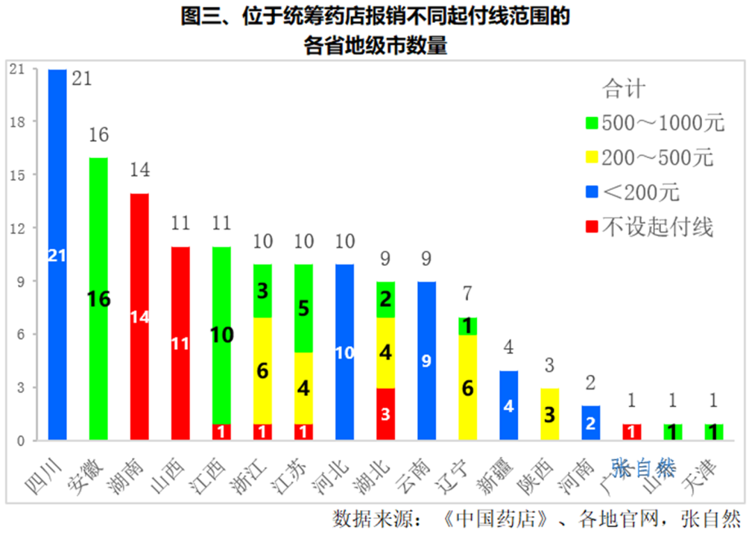 可見(jiàn),湖南和山西政策最友好,其屬下地級(jí)市都不設(shè)起付線,四川、河北、云南、新疆和河南的也不錯(cuò),所轄各市的起付線均在200元以下。(詳見(jiàn)圖三)
