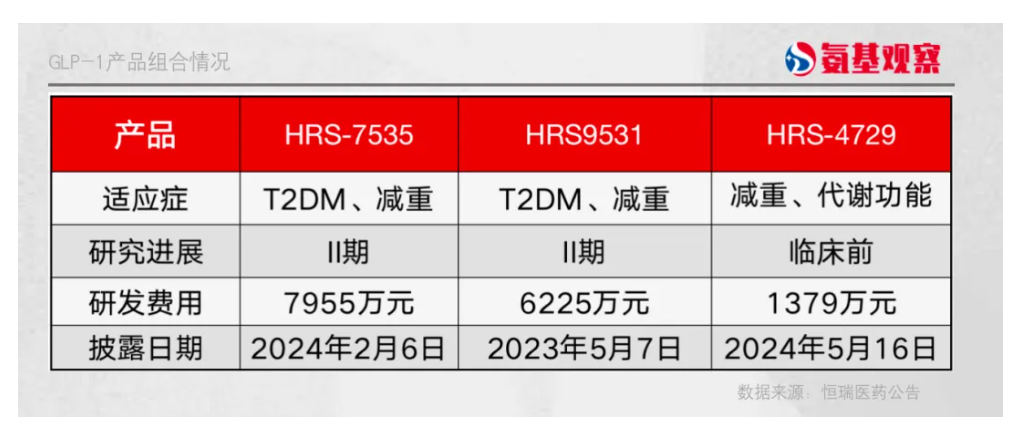 Hercules看中的三款產品,分別是口服小分子GLP-1受體激動劑HRS-7535,GLP-1/GIP雙受體激動劑多肽注射和口服產品HRS9531以及下一代腸促胰島素產品HRS-4729。其中,HRS-7535、HRS9531處于臨床II期,HRS-4729則處于臨床前研究。