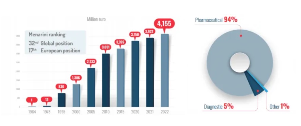 意大利作為歐洲生物醫(yī)藥制造傳統(tǒng)強國,在制藥領(lǐng)域具有獨特的技術(shù)、產(chǎn)品和龐大的研發(fā)體系,尤其是在抗腫瘤、抗精神病等藥物的制造技術(shù)與產(chǎn)品在國際處于領(lǐng)先地位。2018年意大利正式趕超德國成為歐盟最大的制藥國,產(chǎn)業(yè)規(guī)模達312億歐元(德國300億歐元),占全球醫(yī)藥市場份額約3%。Menarini集團作為意大利最大的醫(yī)藥企業(yè),在歐洲制藥公司中更是位居前列,同時還是全球TOP50的藥企。