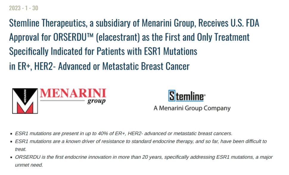 2、2023年1月,FDA批準Elacestrant(Orserdu)用于既往接受過至少一線內(nèi)分泌治療后疾病進展的ER+、HER2-、ESR1突變的絕經(jīng)后女性或成年男性晚期或轉(zhuǎn)移性乳腺癌患者。在美國和歐洲由Menarini的全資子公司Stemline Therapeutics將Orserdu商業(yè)化,這也是FDA批準的首個口服SERD(選擇性雌激素受體降解劑),在此之前,阿斯利康的氟維司群(fulvestrant)是唯一獲批上市的SERD靶向藥,但是只能肌肉注射。