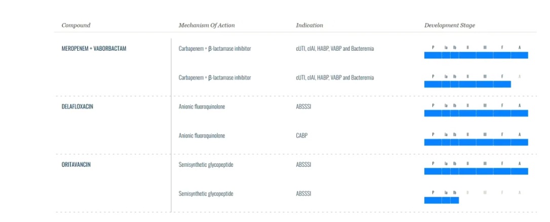 奧利萬星是一種半合成的糖肽類抗生素,其半衰期較長,可在3小時內(nèi)靜脈滴注單劑量(1200 mg)。它有三種作用機制:(1)通過與肽聚糖前體的莖肽結(jié)合,抑制細胞壁生物合成的轉(zhuǎn)糖基化(聚合)步驟;(2)通過與細胞壁的肽橋接片段結(jié)合,抑制細胞壁生物合成的轉(zhuǎn)肽(交聯(lián))步驟;(3)破壞細菌膜完整性,導致去極化、透化和快速細胞死亡。目前已在美國和歐盟獲得批準,用于治療成人急性細菌性皮膚和皮膚結(jié)構(gòu)感染(ABSSSI),同時也在開發(fā)一種新的奧利萬星制劑,新型制劑有利于藥物溶液的重組,并可在更短的時間內(nèi)給藥。