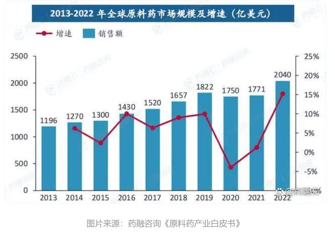 從全球范圍來看,原料藥市場在經(jīng)歷了2020年新冠疫情的沖擊后逐漸恢復(fù)增長。全球原料藥市場規(guī)模在2020年受新冠肺炎疫情影響與2019年相比有所下滑,從1822億美元降至1750億美元,下降3.95%;但很快,市場從2021年開始便恢復(fù)了增長,2022年全球原料藥市場規(guī)模達到2040億美元。