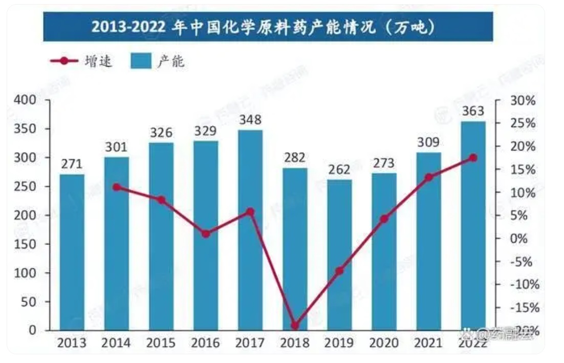 國內(nèi)原料藥市場也呈現(xiàn)出相似的趨勢。在2013-2017年間中國原料藥的產(chǎn)能整體呈增長趨勢;但在2018-2019年受環(huán)保安全監(jiān)管趨嚴(yán)以及供給改革不斷深化的影響,一些高能耗、高污染、工藝技術(shù)落后、過剩的原料藥產(chǎn)能被淘汰,中國原料藥產(chǎn)能下降明顯;2020年我國原料藥市場開始恢復(fù)增長,但受疫情影響,增長緩慢,增速僅約為4.2%;從2021年開始增長速度加快,相比2020年增速約為13.2%;2022年中國原料藥產(chǎn)能已超過了2017年時最高產(chǎn)能,相比2021年增速約為17.5%。
