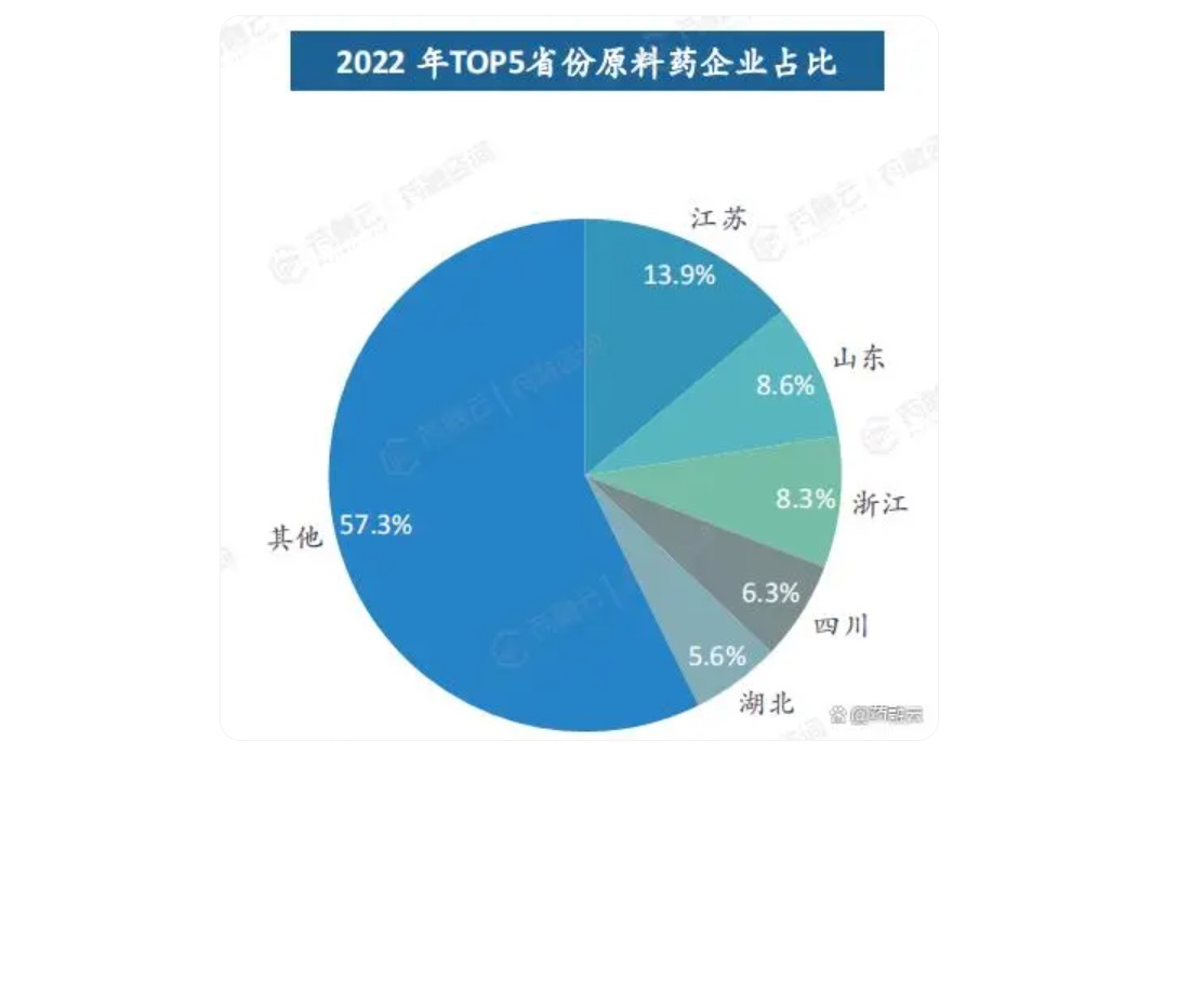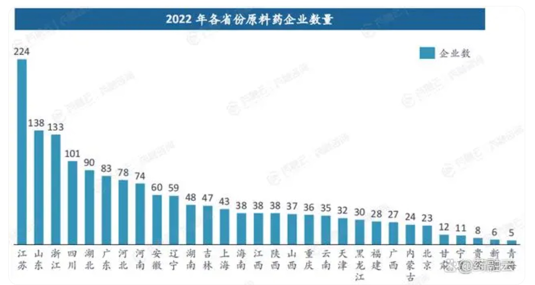 其中,企業(yè)數(shù)>100家的有4省,分別為江蘇(224家)、山東(138家)、浙江(133家)、四川(101家),4省合計占全國原料藥企業(yè)總數(shù)的近四成(37%)。